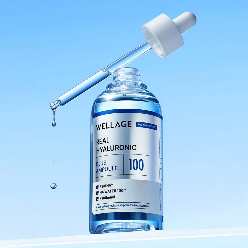 WELLAGE is known in Korea for high-performance hydration science and innovative HA delivery systems. The Real Hyaluronic Blue Ampoule 100 uses a multi-weight HA complex that penetrates different layers of the skin for deep, lasting hydration.