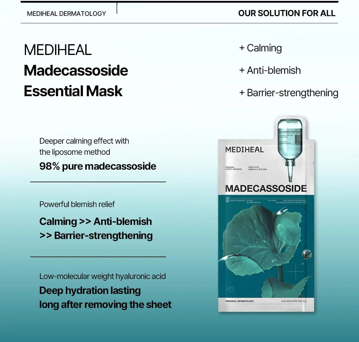Experience fast-acting calm and deep moisture with MEDIHEAL Madecassoside Essential Mask Blemish Repair. This vegan-certified sheet mask is crafted for stressed or irritated skin, using 98% pure madecassoside and liposome-delivery technology to soothe redness, reinforce the skin barrier, and fade post-blemish marks. The formula also includes hyaluronic acid for rich hydration, leaving your skin comfortable, plump and visibly smoother.